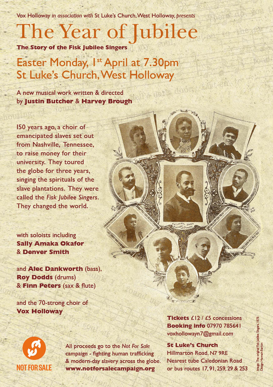 We are celebrating the history of the Fisk Jubilee Singers this Easter and supporting the work of the Not for Sale HOME soup campaign as they work to end modern slavery and trafficking. Vox Holloway have a lovely program of old and new spirituals on offer on Easter Monday, 1st April at &.30pm at St Luke’s West Holloway. Tickets are now on sale at £12 and £5 concessions. Please use the contact form to the right if you wish to reserve tickets.