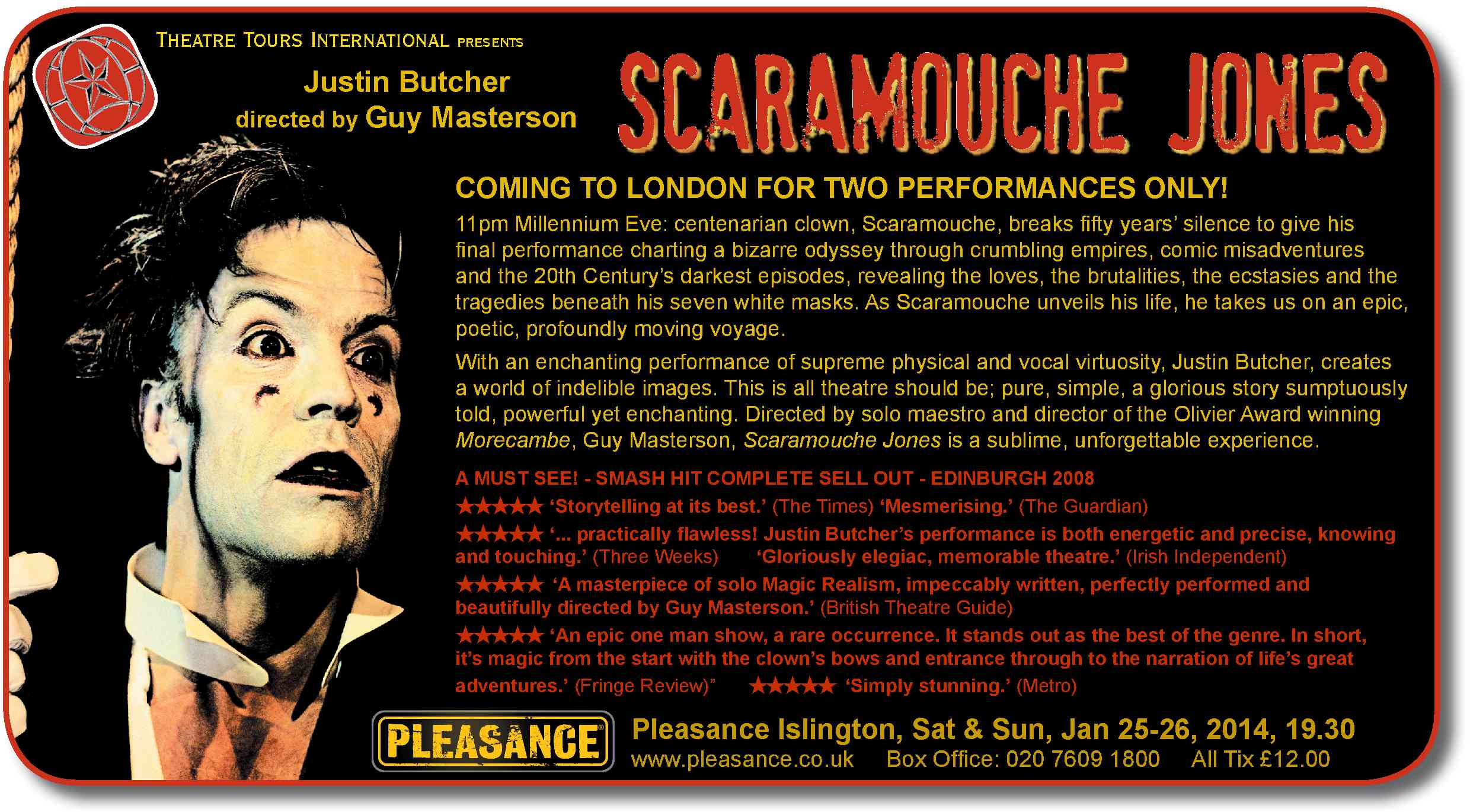 Justin Butcher invites invite you to the Pleasance Theatre, Islington, next weekend, where he is doing just 2 performances of his one-man play, Scaramouche Jones, on January 25th & 26th at 7.30pm. Box office: 020 7609 1800, or book online at http://www.pleasance.co.uk. Pleasance Theatre, North Road, London N7 9EF. Nearest tube Calendonian Road, Piccadilly line.