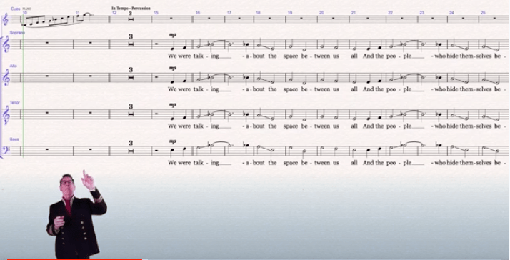 There are four separate sections. Just click on the vocal part that suits your voice. Our second rehearsal will take place on Tuesday 22 September at 7pm. It, too, will stay online until 29 September, so you can catch up at your leisure.